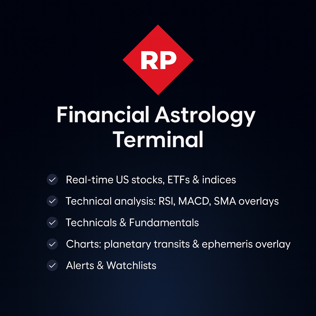 Real-time US equities, indices, and ETFs with planetary overlays, aspect calendars, and smart alerts to sharpen risk management. Track live moves across regular and extended sessions, visualize transits on charts with lunar phases and aspect strength, build focused watchlists, and get timely notifications around key planetary events and macro catalysts—so every decision is grounded in data and timing intelligence.